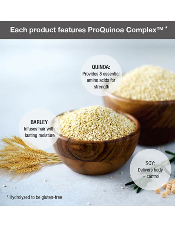- QUINOA : Une protéine complète qui contient huit acides aminés essentiels pour apporter hydratation et force à chaque mèche de cheveux.