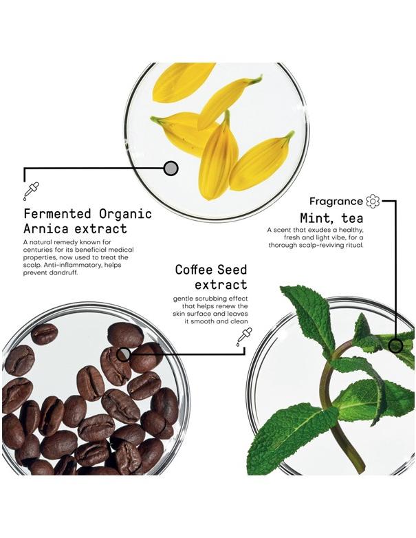 - Le Parfum : Menthe et Thé : Un parfum qui dégage une ambiance saine, fraîche et légère pour un rituel de revitalisation du cuir chevelu en profondeur.