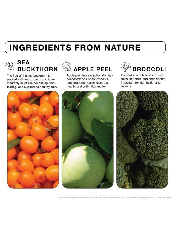 Your new favorite acne solution. This daily supplement targets flare-ups at the source to fight pimples, blackheads, and hormonal acne. Sea buckthorn targets oil glands to stop excess sebum creation, broccoli helps reduce skin inflammation, and apple peel aims to correct uneven skin tone.