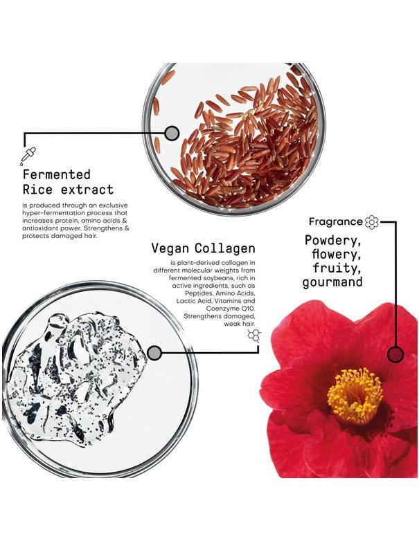 Revitalizing emulsion for damaged hair. Enriched with Fermented Rice Extract, Hyaluronic Acid, and Vegan Collagen. Contains a 100% plant-derived long-lasting film-forming resin, and an organic multifunctional anti-UV plant-derived complex, it conditions and revives the hair. Leaves damaged hair soft and shiny.